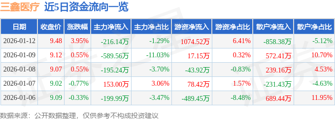 证券之星消息,截至2026年1月12日收盘,三鑫医疗(300453)报收于9.48元,上涨3.95%,换手率4.96%,成交量17.84万手,成交额1.68亿元。