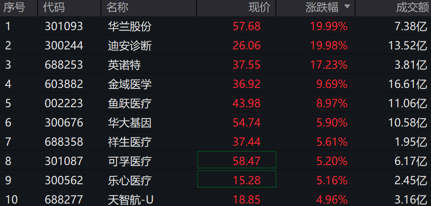 截至2026年1月12日 14:02,中证全指医疗器械指数(H30217)强势上涨1.96%,成分股华兰股份、迪安诊断20CM涨停,英诺特涨超17%,金域医学,鱼跃医疗等个股跟涨。医疗器械ETF(159883)午后涨超2%。