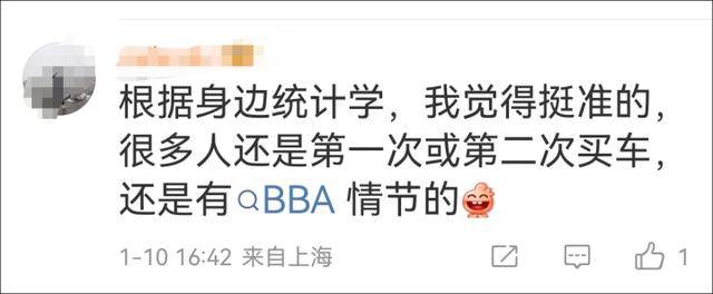 这一调查结论在社交媒体上引发热烈讨论。支持者认为,“根据身边统计学,我觉得挺准的,很多人还是第一次或者第二次购车,还是有BBA(即奔驰、宝马、奥迪等豪华车)情结的。”