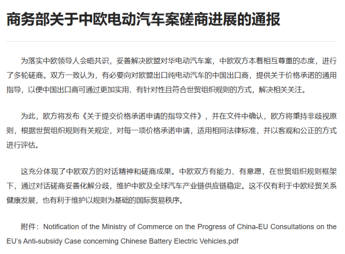 第一电动1月12日消息,商务部发布关于中欧电动汽车案磋商进展的通报。为落实中欧领导人会晤共识,妥善解决欧盟对华电动汽车案,中欧双方进行了多轮磋商达成关键一致。双方一致认为,有必要向中国出口商提供关于价格承诺的通用指导,以便通过符合世贸组织规则的方式解决相关问题。欧方将发布《关于提交价格承诺申请的指导文件》,允许中国电动汽车企业在符合条件的情况下通过提交价格承诺方案来替代此前征收的反补贴税。这一指导文件规定欧盟将依据统一标准、秉持非歧视原则对各企业提交的承诺进行客观公正审查,符合要求的企业可免于高额反补贴税,同时保障市场准入条件。