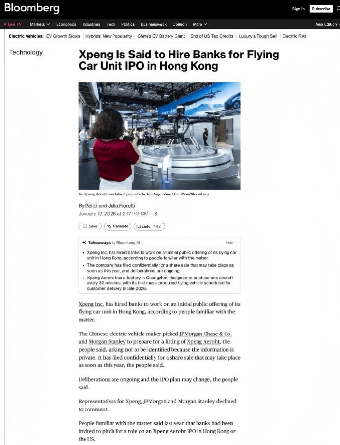 此外,据彭博社报道称,知情人士透露,小鹏汽车被曝已聘请摩根大通和摩根士丹利协助其飞行汽车业务在香港进行首次公开募股(IPO)。报道指出,该事项仍处于筹备阶段,相关细节尚未最终确定。此次IPO计划涉及小鹏汽车旗下的飞行汽车相关业务板块。据悉,小鹏已秘密申请股票出售,该出售可能最早在今年进行。