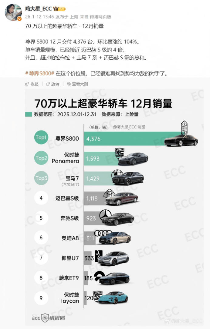 1月12日,博主@嗨大星_ECC分享了70万以上的超豪华轿车12月销量数据。其中,尊界S800轿车12月交付4376台,环比增长约104%。尊界S800的单车销量规模已接近迈巴赫S级的4倍,并超过帕拉梅拉、宝马7系和迈巴赫S级的总和。博主认为,在70万以上价位段,尊界S800已难觅势均力敌的对手。