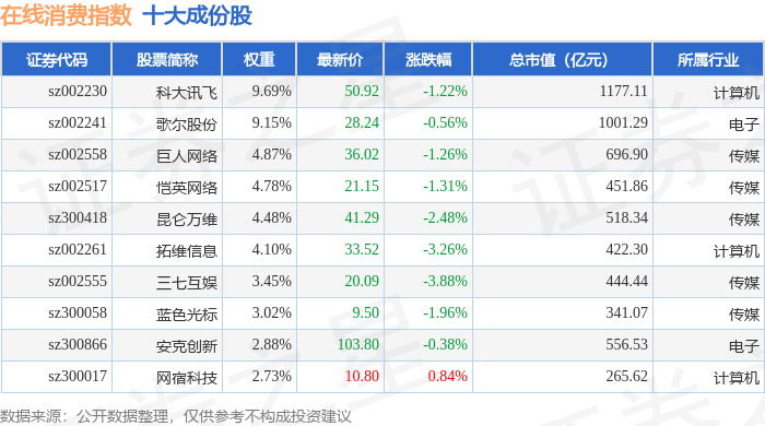 在线消费(399361)指数十大成份股详情如下: