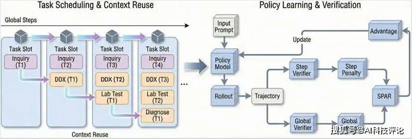 支撑这些结果的,是百川对医疗长决策链训练方式的系统调整。在训练中,复杂的诊疗流程被拆分成多个阶段分别优化,并通过分段流水线强化学习提高整体效率。同时,引入 SPAR 算法,对多轮对话中的每一步进行更精细的奖励和约束,减少无效提问和逻辑跳跃,让模型在保证准确率的同时,保持交互过程的连贯和可控。