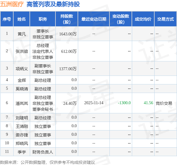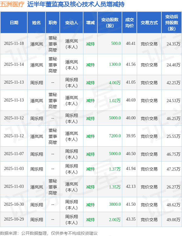 五洲医疗近半年内的董监高及核心技术人员增减持详情如下: