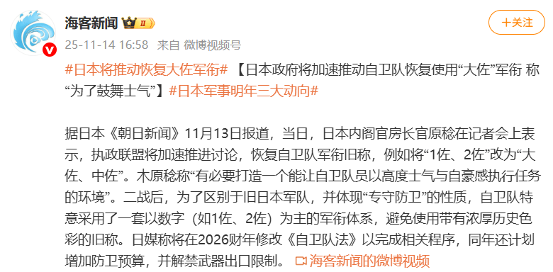 二战后,为了区别于旧日本军队,并体现“专守防卫”的性质,自卫队特意采用了一套以数字(如1佐、2佐)为主的军衔体系,避免使用带有浓厚历史色彩的旧称。日媒称将在2026财年修改《自卫队法》以完成相关程序,同年还计划增加防卫预算,并解禁武器出口限制。