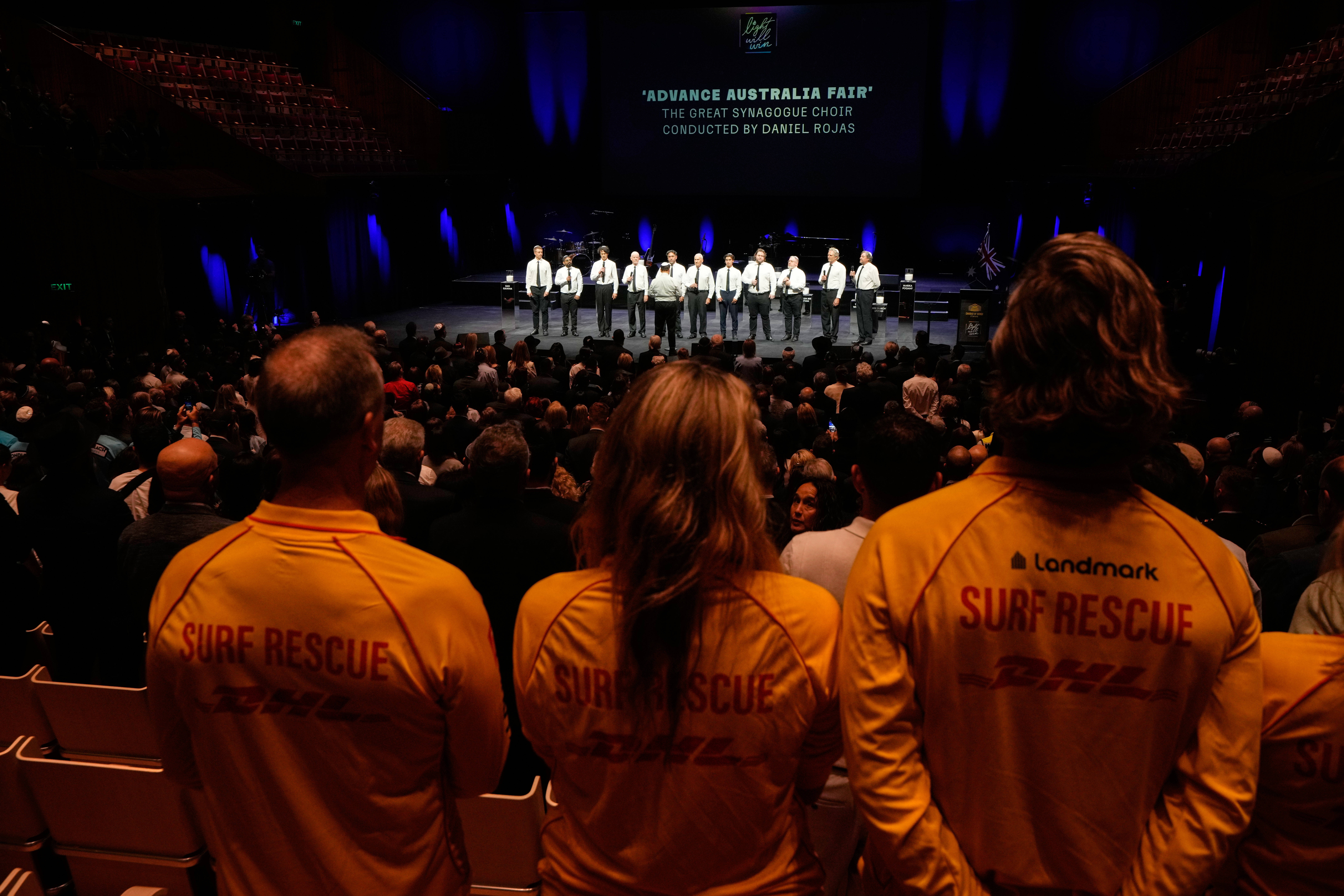 1月22日,澳大利亚邦迪滩枪击事件遇难者家属在悉尼歌剧院参加悼念仪式。 新华社/法新