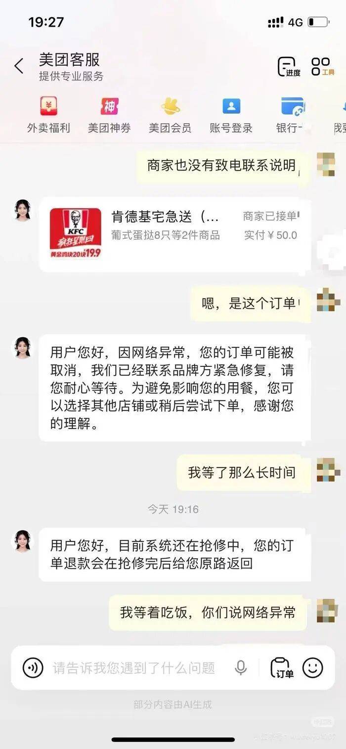 故障持续了约一个小时,还引发了乌龙事件。有广东用户称,因为肯德基迟迟不送且联系不上,只好改点其他外卖,结果后来肯德基恢复配送,两份外卖几乎同时送到。