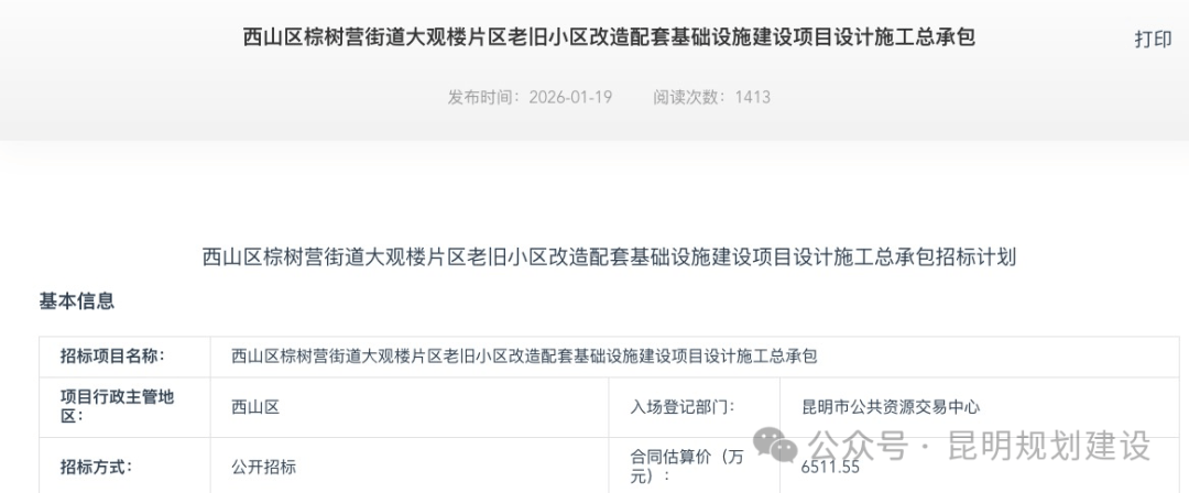 1月19日,云南省公共资源交易信息网发布《西山区棕树营街道大观楼片区老旧小区改造配套基础设施建设项目设计施工总承包》招标计划。