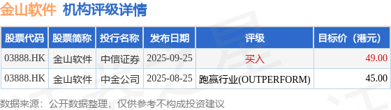 投行对该股的评级以跑赢行业(OUTPERFORM)为主,近90天内共有1家投行给出跑赢行业(OUTPERFORM)评级,近90天的目标均价为47港元。中信证券最新一份研报给予金山软件买入评级,目标价49港元。