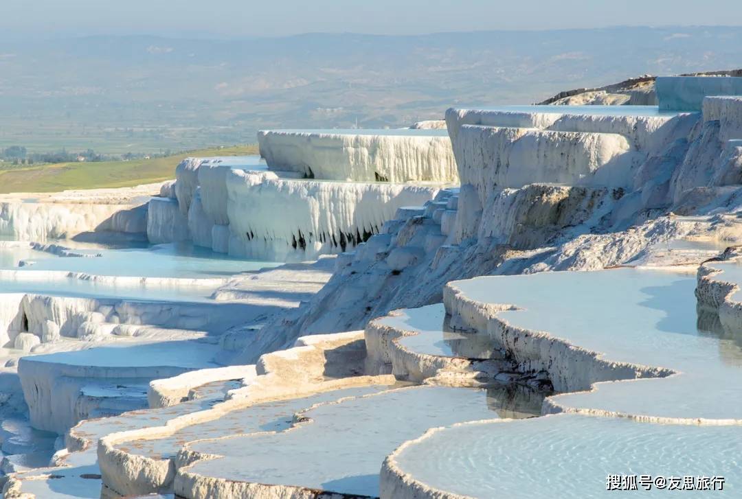 光着脚走在层叠的白色钙化池中,可见的碧蓝泉水倒映着天空。