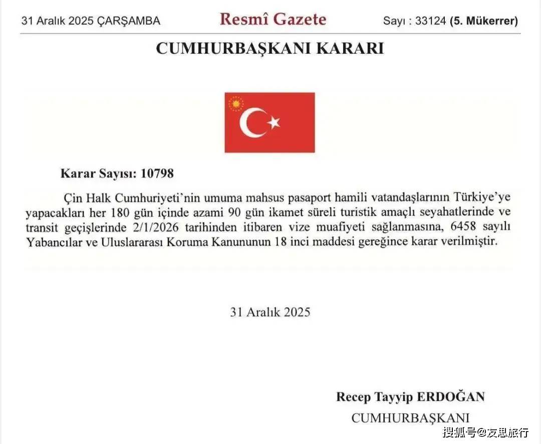 根据土耳其政府官方公报在当地时间2025年12月31日发布的总统令,对持中国普通护照的公民实行免签入境政策。