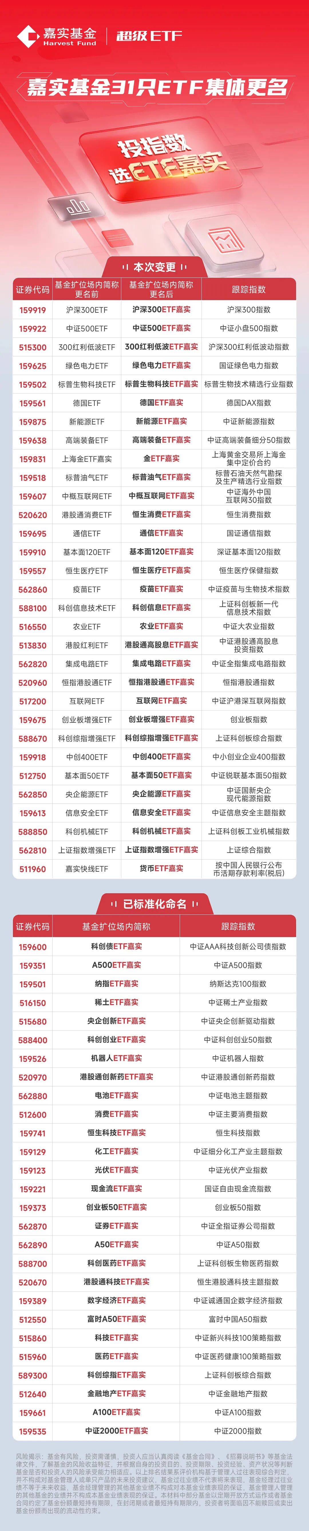 为响应沪深交易所ETF命名规范化要求,提升投资者体验,嘉实基金宣布于1月23日对旗下31只ETF产品实施集体更名,统一采用“标的指数+ETF+管理人名称”的标准化命名模式。本次更名涵盖16只深交所产品和15只上交所产品,至此嘉实基金已有58只产品完成命名规范化变更,所有产品代码保持不变。