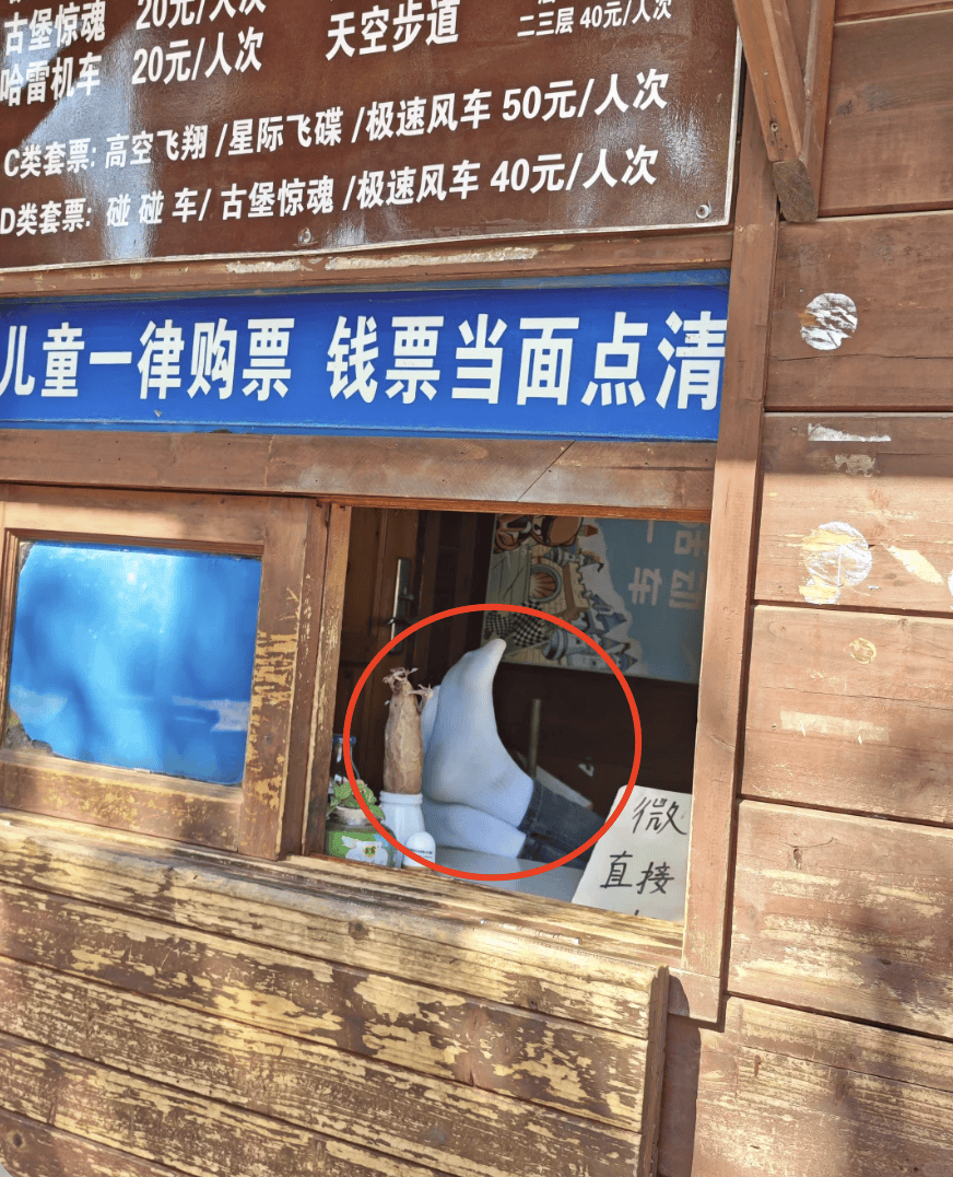 公园里游乐园售票处工作人员脚上桌。网络截图