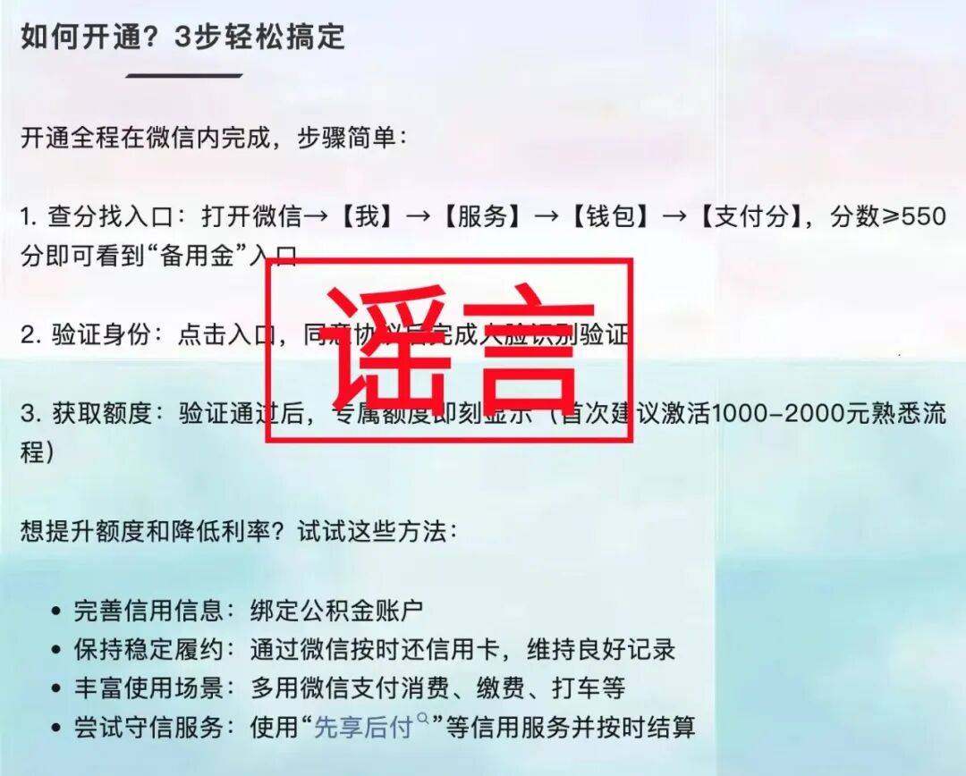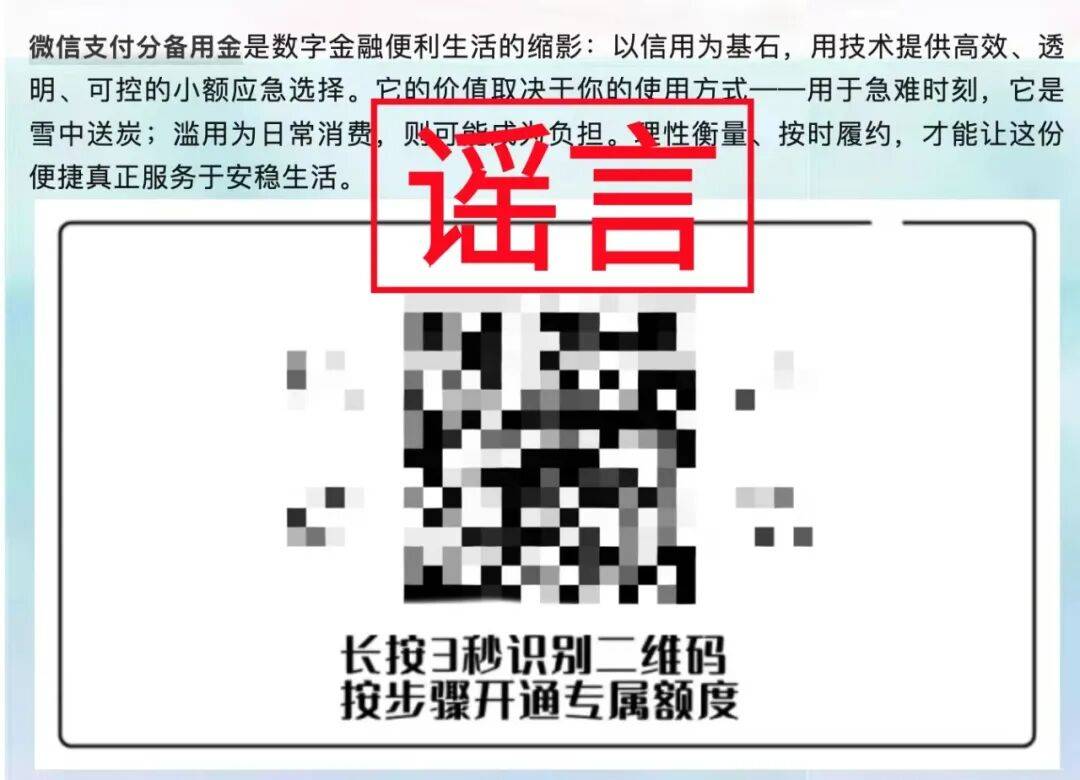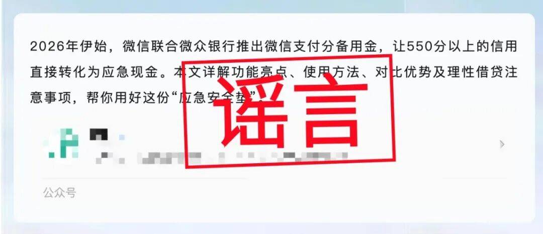 21日,微信官方辟谣平台发布消息:最近,网络上出现部分文章称,“2026年1月,微众银行联合微信推出的‘微信支付分备用额度’正式上线”。