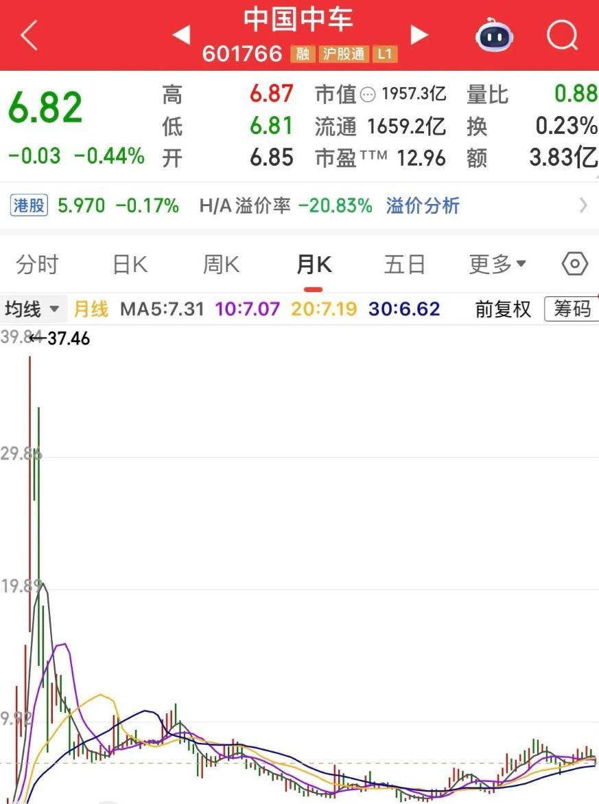 中国中车的走势牵动着更多人的记忆。 作为南北车合并的产物,它曾站在风口,股价在2015年达到37.46元的高点。 如今,股价是6.82元,跌幅82%。 近50万名股东中,仍有大量投资者套在30元以上的区域。 2024年,公司净利润123.9亿元,市盈率13倍。 但它的股价,已经持续下跌了超过十年。 股东人数为49.82万,同比下降了2.91%。