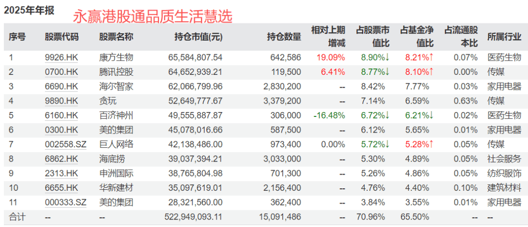 永赢港股通品质生活慧选,以港股为主,也是以“控制波动率、兼顾收益” 为目标,采用 “优质龙头资产 + 成长股” 的配置结构,重仓创新药、游戏、家电、建材、消费等,去年涨了24.78%。