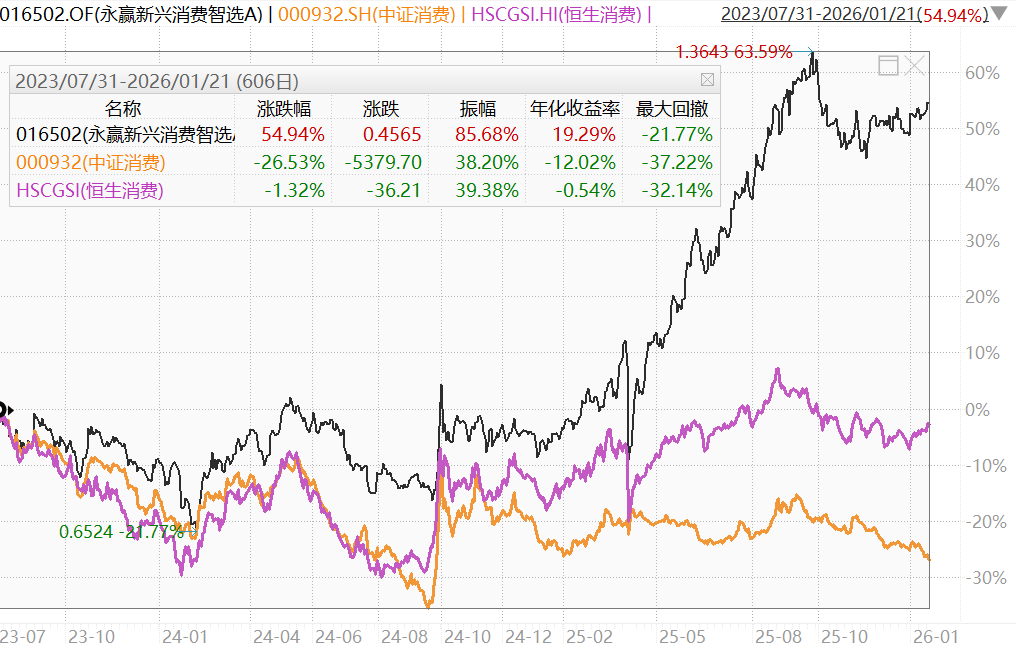 就在我以为消费基金要全军覆没时,没想到会有让人眼前一亮的发现。“永赢新兴消费智选”,去年涨了55.89%,大幅度跑赢A股和港股消费指数,真的可以说阿尔法抓取能力很强了。