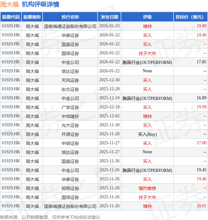 截至2026年1月23日收盘,周大福(01929.HK)报收于14.01港元,下跌0.78%,成交量1477.83万股,成交额2.08亿港元。投行对该股的评级以买入为主,近90天内共有9家投行给出买入评级,近90天的目标均价为18.87港元。国泰海通证券股份有限公司最新一份研报给予周大福增持评级,目标价19.8港元。