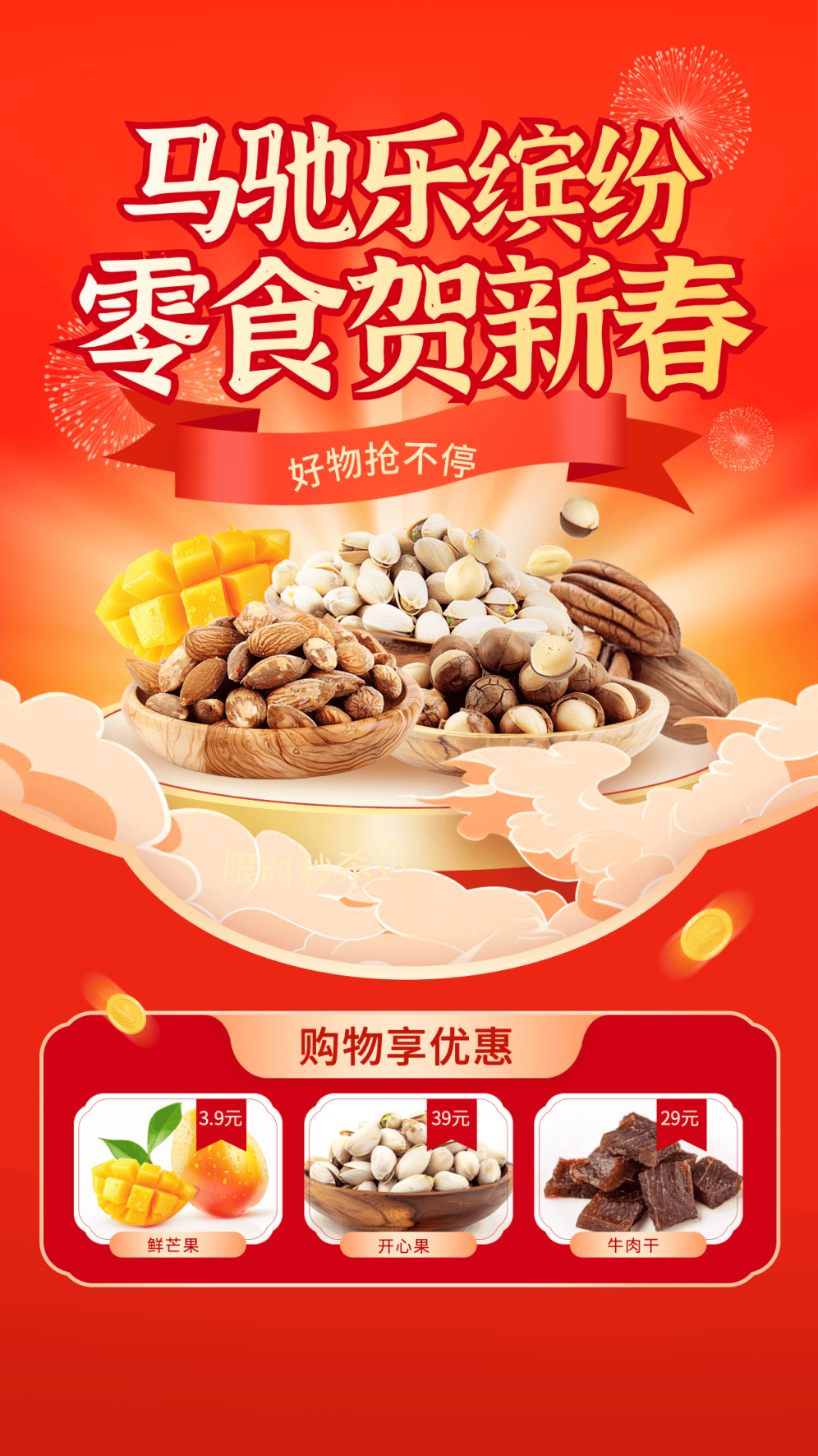 这组年货节海报模板,采用了正红渐变底色与烟花云纹元素,结合坚果零食实景图与促销文案,为年货节促销海报分享营造出缤纷热闹的年货氛围,适合零食、坚果类品牌的年货促销。