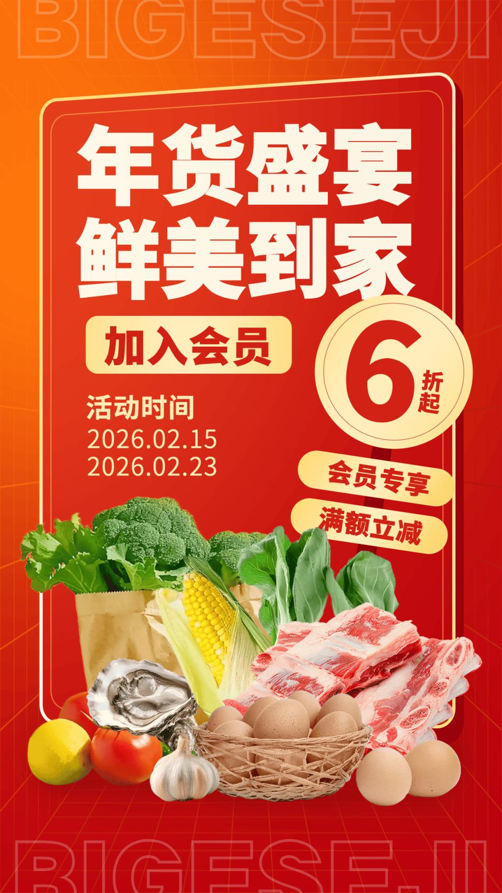 这组年货节海报模板,采用了橙红撞色背景与网格纹理,结合生鲜食材实景图与醒目折扣,为年货节促销海报分享营造出实惠新鲜的年货氛围,适合生鲜、商超类品牌的年货促销。