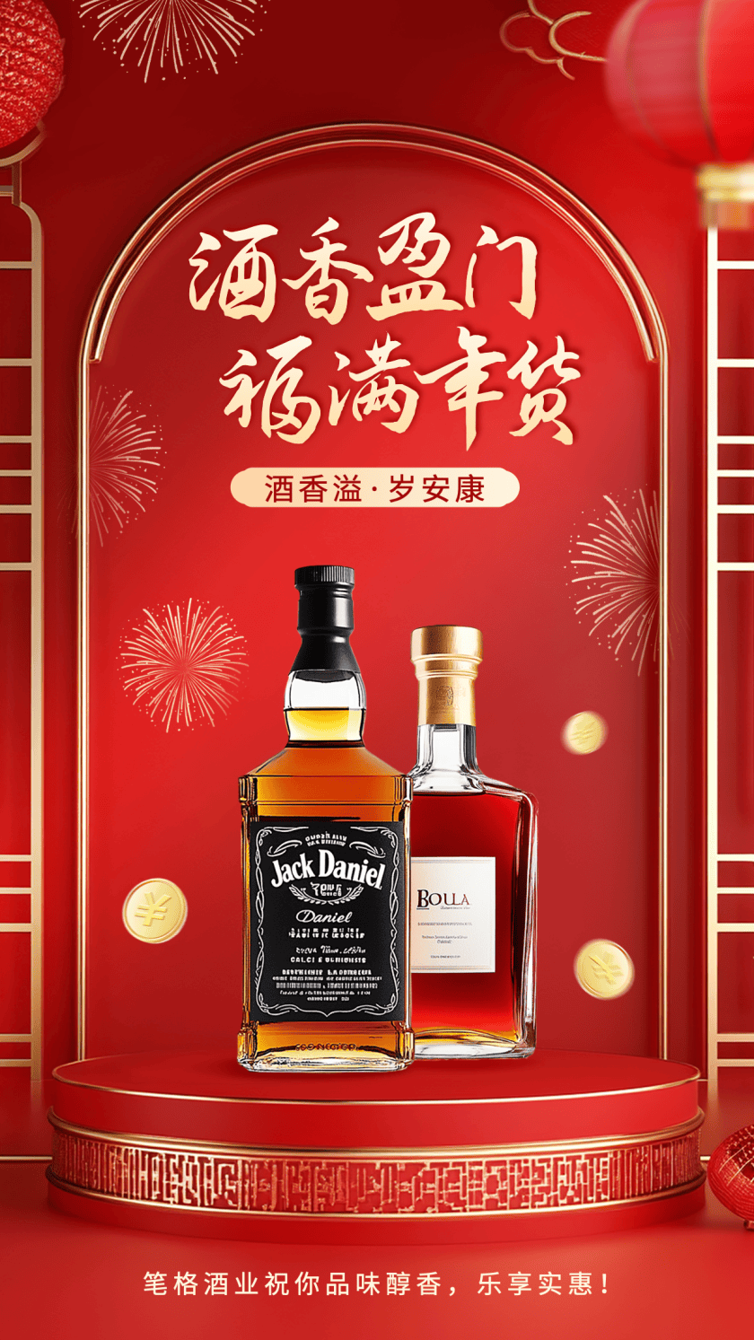 这组年货节海报模板,采用了宫墙红拱门与鎏金线条元素,结合洋酒实景图与吉祥文案,为年货节促销海报分享营造出高端雅致的年货氛围,适合酒类、礼品类品牌的年货促销。