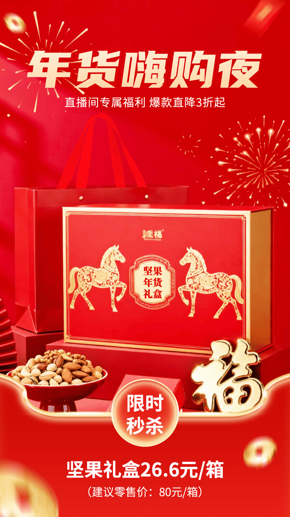 这组年货节海报模板,采用了红金质感背景与烟花福字元素,结合马年金纹坚果礼盒与紧迫感文案,为年货节促销海报分享营造出高端且具稀缺性的直播氛围,适合坚果礼盒、高端礼品类。