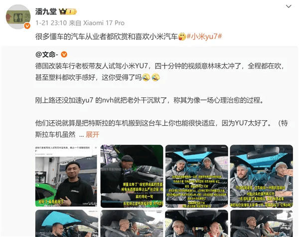 1月23日消息,近日,有德国改装车行老板带友人试驾小米YU7,整个40分钟的视频中,全都是在夸小米的好,甚至塑料都吹手感好,这你受得了吗?