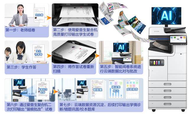 爱普生智慧阅卷方案借助“冷印王”AM-C5000a与AI技术实现自动阅卷,大幅提升效率。教师仅需扫描答题卡,系统即上传云端完成批改,并可轻松将判断结果再次打印到试卷上,显著减轻阅卷负担。