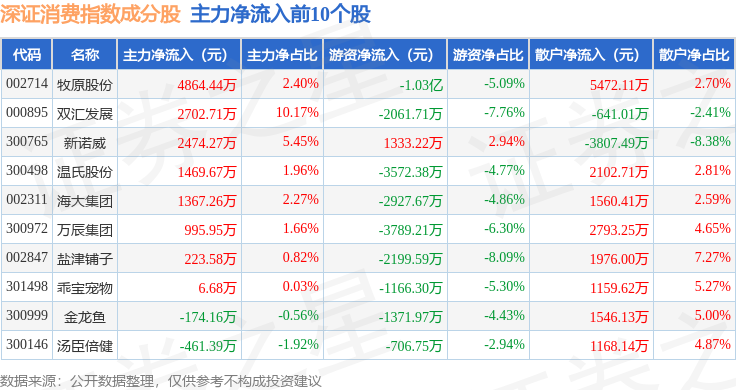 资金流向方面,深证消费(399617)指数成份股当日主力资金净流出合计4.85亿元,游资资金净流出合计1.54亿元,散户资金净流入合计6.4亿元。成份股资金流向详情见下表: