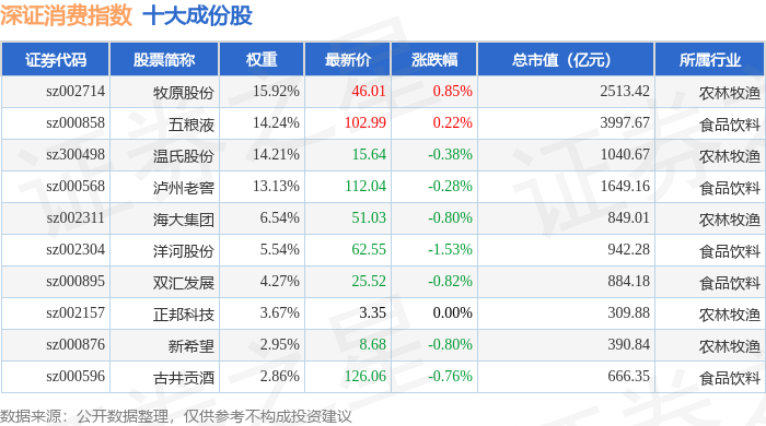 深证消费(399617)指数十大成份股详情如下: