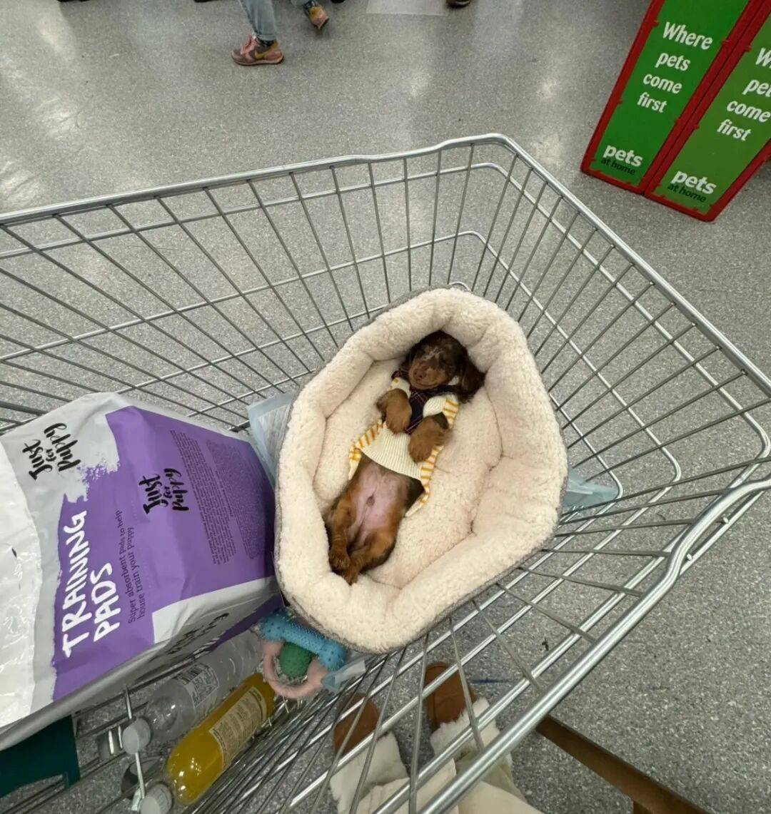 这天,主人照例带着狗子逛超市,谁知道逛着逛着,这小家伙居然直接在小窝里睡着了!
