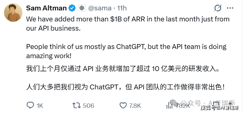 他写道:"大家主要把我们当成ChatGPT,但API团队做得非常出色!"