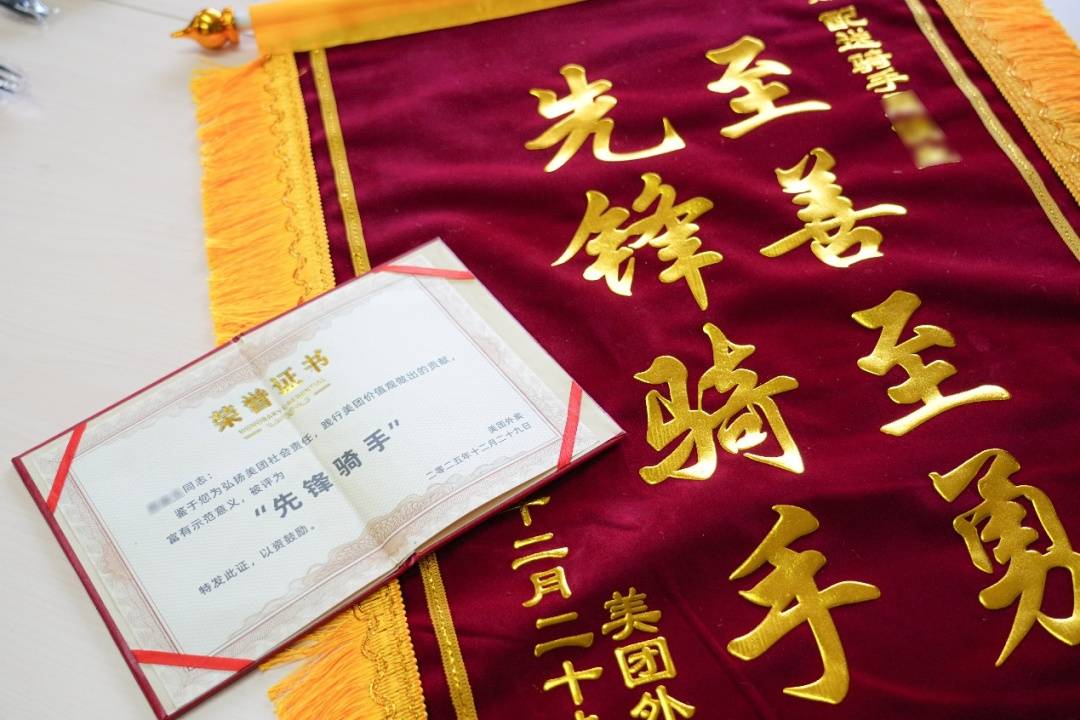 美团平台给见义勇为的小周颁发“先锋骑手”奖励。王鹏/摄