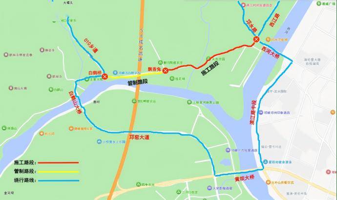 (三)具体绕行路线,可经滨江路中段、南河路、黄坝大桥、010乡道、邛窑大道、邛名高速进行绕行。
