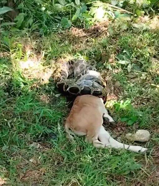 近日有网友反映,9月14日,广东汕尾陆河县河田镇山上有蟒蛇在吃牛。视频显示,一条满身斑纹的大蛇缠住了小牛的头部,小牛已无法动弹。视频发布者描述,发现时牛头已经被吞下一半。