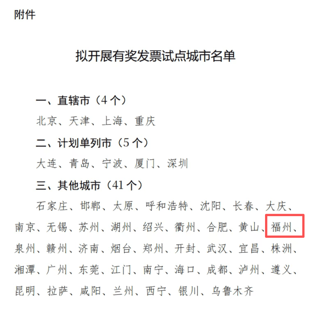 根据《财政部 商务部 税务总局关于开展有奖发票试点工作的通知》要求,商务部、财政部、税务总局于近期组织开展有奖发票试点城市评审工作。根据评审结果,拟确定50个城市开展有奖发票试点。