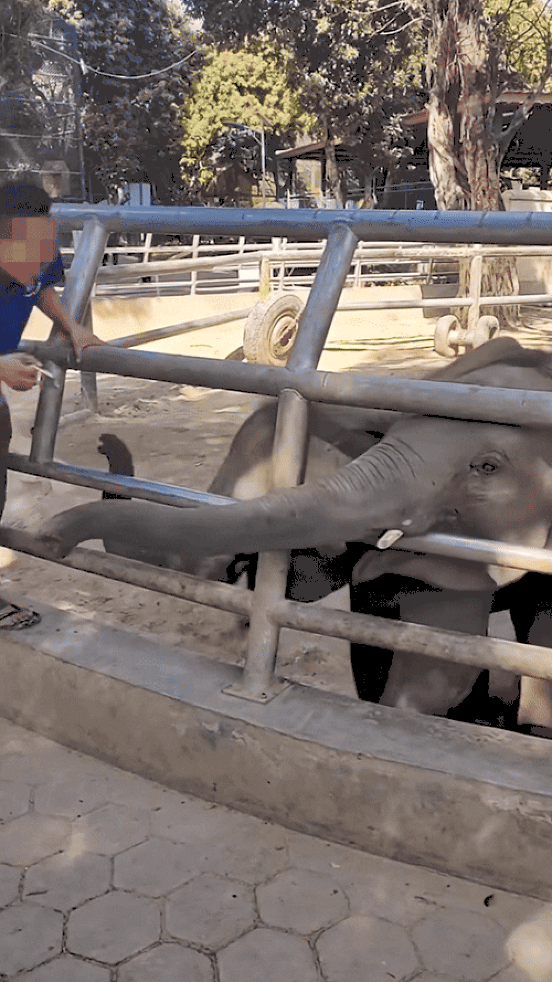 网友拍摄的这段视频显示,在一处动物园中,两只小象将鼻子伸出围栏讨要食物,一名身穿蓝色上衣的男子站在围栏旁,手上拿着一把金属锁。其中一只小象的鼻子碰到了男子的腿,男子挥动金属锁用力向小象头部砸去,同时高声呵斥,小象向后退了几步又伸出鼻子,男子再次挥锁砸向小象。