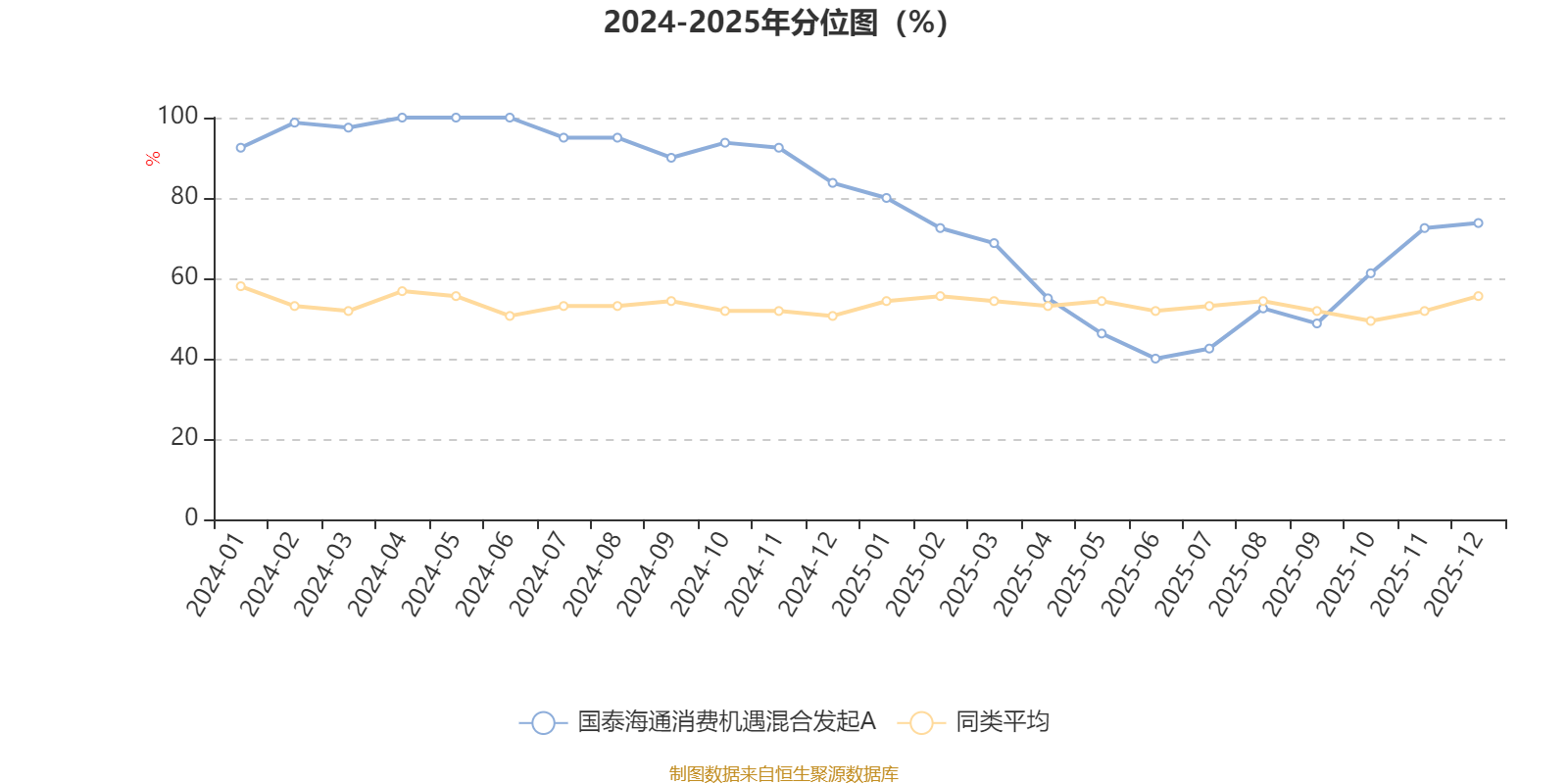 通过所选区间该基金净值增长率分位图,可以观察该基金与同类基金业绩比较情况。图为坐标原点到区间内某时点的净值增长率在同类基金中的分位数。