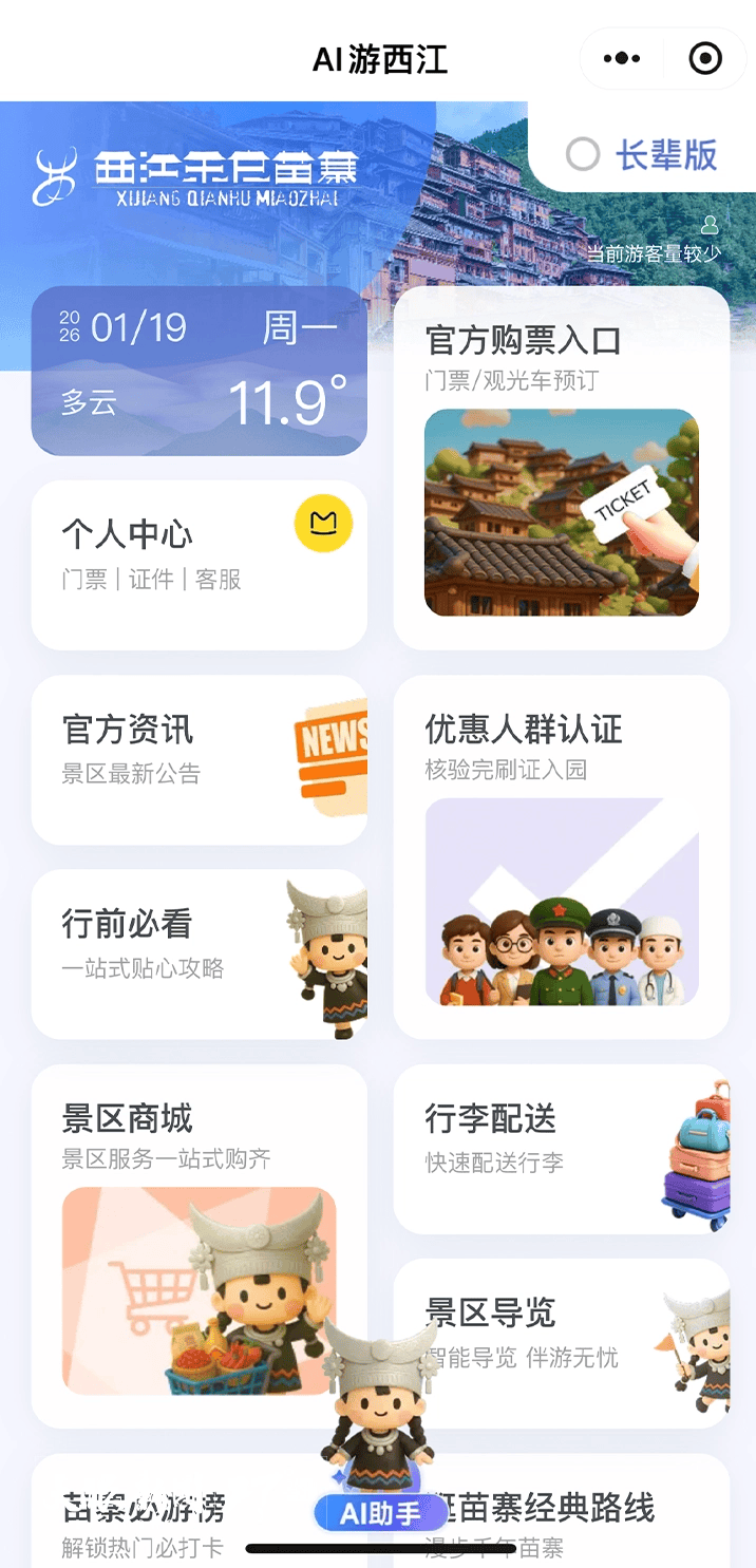 西江千户苗寨地处山间谷地。面对不愿意拖着行李爬坡上坎的游客,景区因地制宜推出了行李寄存和配送服务。数据显示,2025年景区配送行李75000件,寄存行李28000件。面对不喜欢花费大量时间排队进寨子的游客,景区开通了15元含观光车票的VIP快速通道。两者都在服务游客的同时,实现了经济增量。而对于景区内目前最火的业态旅拍,“AI游西江”智能体又给出了从拍摄价格到拍摄时间的温馨提示,让不良商家无处遁形。