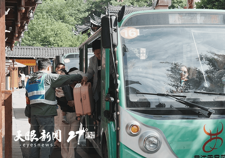 景区工作人员帮助游客配送行李。
