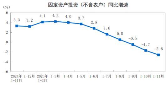2025年1—11月份,全国固定资产投资(不含农户)444035亿元,同比下降2.6%。其中,民间固定资产投资同比下降5.3%。从环比看,11月份固定资产投资(不含农户)下降1.03%。