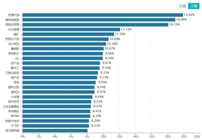 从概念主题板块的表现看,玻纤、锂电电解液、海南自贸港、光伏、电池等涨幅居前。