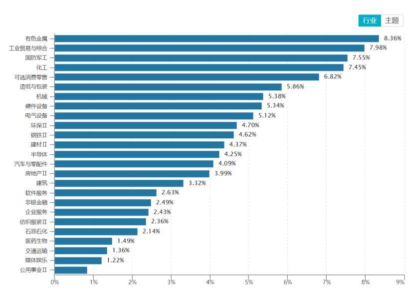 从行业板块表现来看,有色金属、工业贸易、国防军工、化工等涨幅居前,公用事业、媒体娱乐、交通运输、医药生物等涨幅相对落后。