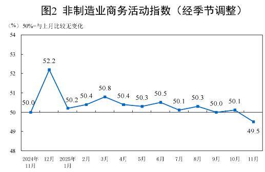 11月份,非制造业商务活动指数为49.5%,比上月下降0.6个百分点。