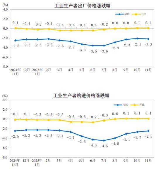2025年11月份,全国工业生产者出厂价格同比下降2.2%,工业生产者购进价格同比下降2.5%;工业生产者出厂价格和购进价格环比均上涨0.1%,涨幅均与上月相同。1—11月平均,工业生产者出厂价格比上年同期下降2.7%,工业生产者购进价格下降3.1%。