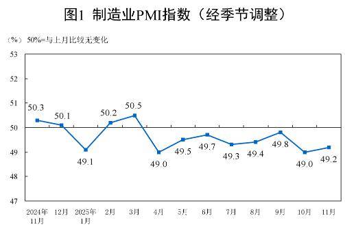 11月份,制造业采购经理指数(PMI)为49.2%,比上月上升0.2个百分点,景气水平有所改善。