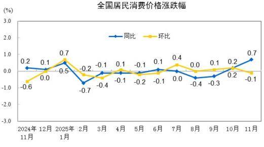 2025年11月份,全国居民消费价格同比上涨0.7%。1—11月平均,全国居民消费价格与上年同期持平。11月份,全国居民消费价格环比下降0.1%。