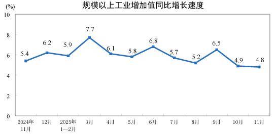 11月份,规模以上工业增加值同比实际增长4.8%(增加值增速均为扣除价格因素的实际增长率)。从环比看,11月份,规模以上工业增加值比上月增长0.44%。1—11月份,规模以上工业增加值同比增长6.0%。