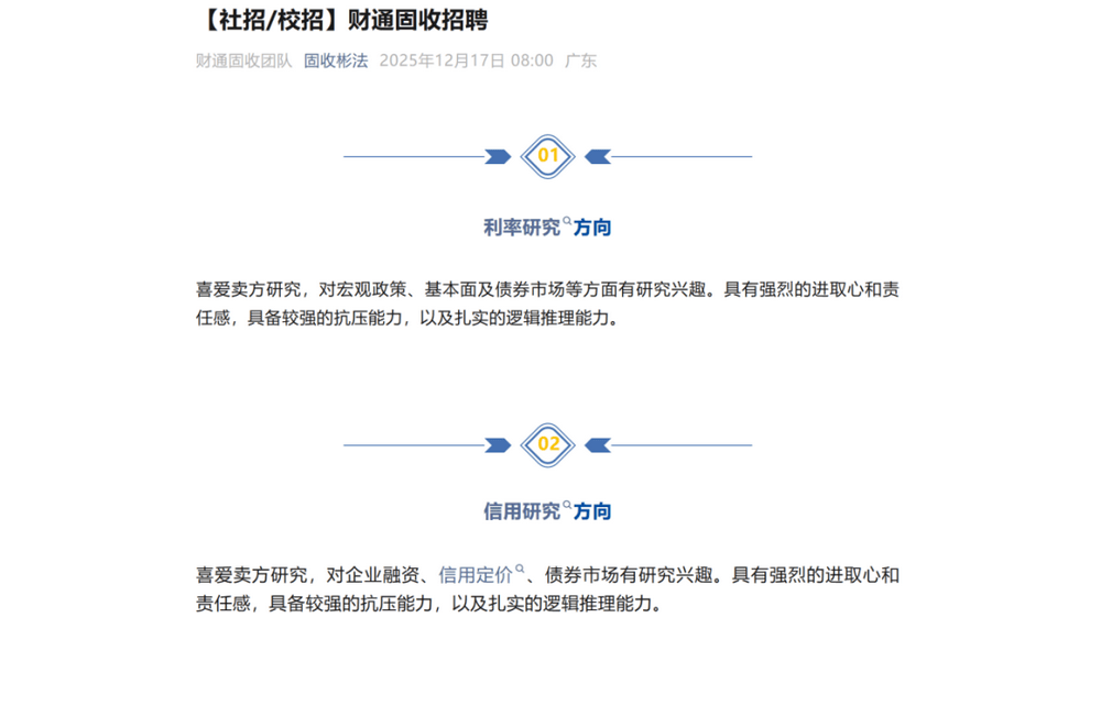12月17日,财通证券研究所固收团队通过公众号发布分析师招聘信息。主要涉及利率研究、信用研究两个方向,从要求来看,社招要求2022年及以后毕业,校招要求2026年毕业,重点大学硕士及以上学历。并且能够独立完成1篇深度报告,并完成答辩;配合完成其他日常工作。